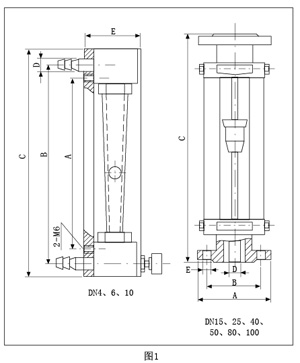 LZB/LZB-( )F流量计的锥管为光滑内壁管(见图4),通径DN15以上的流量计,浮子通过导杆 上下移动,保持稳定;LZJ/LZJ-( )F流量计锥管 内壁有三条导向凸筋,使浮子保持稳定(见图4)。通径DN10以下的流量计采用软管连接,配有 针形流量调节阀;通径DN15以上流量计采用法兰连接。