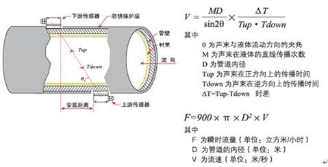 ST-100H型手持式超声波流量计利用了低电压、多脉冲时差原理,采用高精度和超稳定的双平衡信号差分发射、差分接收数字检测技术,当超声波束在液体中传播时,液体的流动将使传播时间产生微小变化,其传播时间的变化正比于液体的流速。零流量时,两个传感器发射和接收声波所需的时间相同(可实际测量零流量的技术),液体流动时,逆流方向的声波传输时间大于顺流方向的声波传输时间。其关系符合下面表达式: