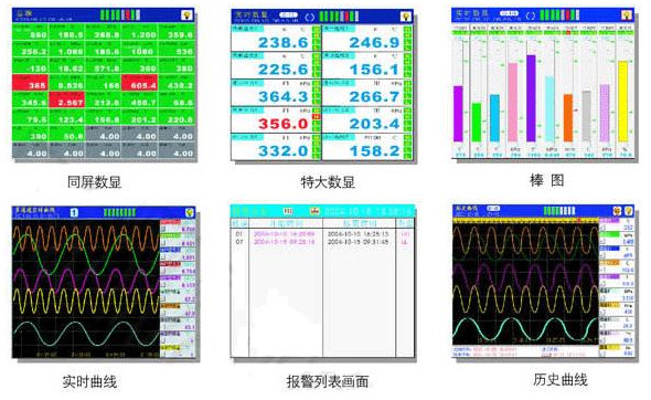 中长图彩屏无纸记录仪,40路输入,可输入标准电流、标准电压、频率、毫伏、热电偶、热电阻等信号。具有传感器隔离配电输出、继电器报警输出、变送输出、流量积算、温压补偿、历史数据转存、打印以及远程通讯功能。